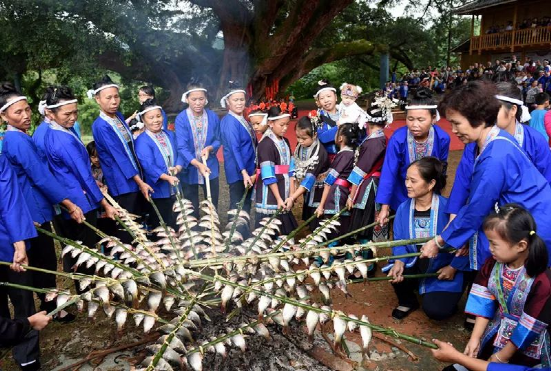 “百家宴”是侗族待客的最高禮儀。每逢村寨互訪或有特別尊貴的客人來時,全村各戶自備酒菜飯,一起到鼓樓坪“一”字型擺開長桌,客人可從第一桌吃到最后一桌,你來我往、觥籌交錯、熱鬧非凡。據說在當地流傳著這樣一個說法:“吃百家飯、納百家福、聯百家心、驅百家邪、成百樣事、享百年壽”——各寨
