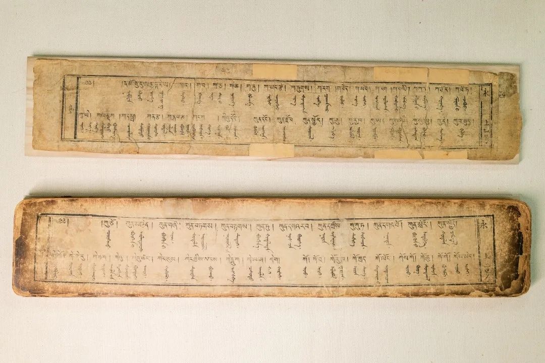 藏蒙對照詞典《詳解月光辭典》又稱《浩月輝映詞典》,該詞典由阿拉善拉隆巴阿旺丹德爾編著,清道光十八年(1838)北京嵩祝寺木刻本。1卷,139葉,頁面尺寸10.6×56厘米,版框尺寸7.5×49厘米,四周雙欄,梵來裝。每頁以藏蒙、藏蒙四行為階梯排列,每列35行,每行1字。頁面左側有藏文頁碼,右側有漢字《永》和漢文頁碼。