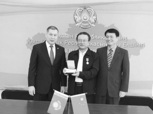 10月17日,艾克拜爾(中)被授予哈薩克斯坦外交部建立外交關系25周年金質獎章,哈薩克斯坦駐華大使沙赫拉特·努雷舍夫(左)為其頒發了獎章。