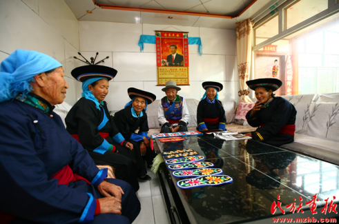 東溝村大莊村老年協會的土族老人們在交流刺繡技藝 引自民族畫報