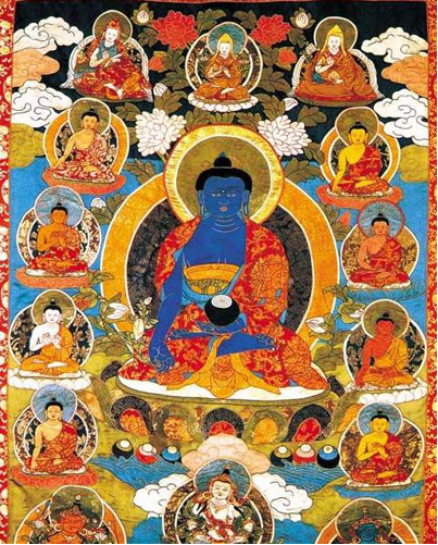 堆銹是青海塔爾寺獨創的一種藏族繪畫藝術形式,屬唐卡中的“國唐”。其制作特點是用各色質地不同的綢緞綾羅剪出人物形狀和各種圖案形狀,然后在形象或圖案背后充塞羊毛、棉花等物,再逐一繡在黑色底子的大幅布幔上,使畫面產生出豐富而生動的立體感和織物特有的肌理感,具有淺浮雕式的藝術效果。