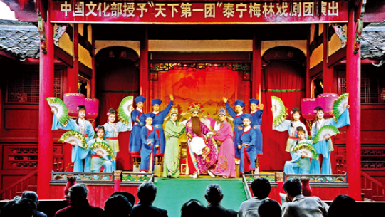 被譽為全國“天下第一團”的福建泰寧梅林戲俗稱“泰寧大戲”,流行閩贛邊陲,相傳清乾隆年間,由徽班經江西、浙江傳至閩而形成的一種鄉土戲。 當時,泰寧縣朱口的梅林有一寡婦周氏,家境豪富。有一年她過生日,聘請浙江的徽班來家,連演數日戲為其祝壽。后來,周氏為了能常看到戲,籌錢聘徽班藝人為家鄉子弟傳藝。從此,梅林鄉人以學戲為一大樂事,每逢誰家子弟學戲出師登臺演出,親友便送禮恭賀。在梅林及附近鄉村,人人都會唱幾段“土戲”。當時流傳一首民謠:“梅林十八坊,十個弟子九擔箱,敲起叮鐺鼓,唱起摩郎腔,茅擔抬石臼,抬到坪中央,搭起戲臺來,唱到大天光”。這種表演方式形成了梅林戲樸實、粗獷的藝術風格,唱念打做都有一定的程式動作,唱腔以皮簧、撥子、吹腔為主,尚有南詞北調,弦索、四平調、青板,小調等;樂器分文樂(弦樂、管樂)、武樂(鑼、鼓、板);音樂曲調以弦樂伴奏和吹奏樂為主。行當有“七緊、八寬、九逍遙”之稱,角色也分生、旦、凈、末、丑,行當全、分工細,生、旦唱詞大嗓開小嗓落,每句都有“噫”的拖音,山歌風味濃。花臉唱腔節奏強烈,老生唱腔變化多,聲調高昂,丑行唱念結合,全劇粗獷與婉轉相兼,別有情趣。服飾精致古野考究,化裝時常在眉與唇間飾以紅點更覺可愛,加上語言由過去講當地的“土官話”改為現在的普通話上演,效果更佳,因而深受觀眾喜愛。傳統劇目有《飛龍帶》、《蘭腰帶》、《乾坤帶》、《鴛鴦帶》、《雙貴》、《單貴圖》等。