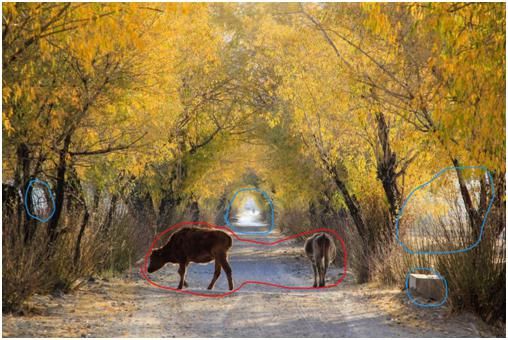 這幅片子用藍色部分標注出來的地方,都是相對比較亮的有高光的地方,它們對照片中的主體(圈起的紅色部分),兩只牛形成了干擾,使得觀看者的目光不能集中在主體身上,總是被這幾個藍色高光部分所吸引。