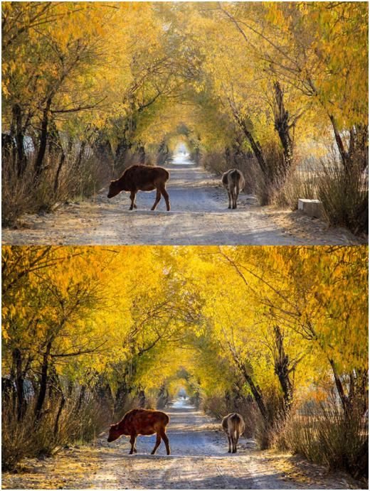 我們將遠處部分的高光壓低,提亮了一下黃色的樹葉和地面的光照,加強了地面的陰影,這樣就有了一個比較通透明快的感覺,空間的縱深效果也有了加強。另外也稍微提亮了牛身上的亮度,但不能提的太亮,因為這樣的話會使片子的噪點比較大,同時也會失色。