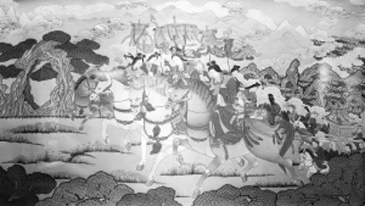 《文成公主進藏》及其細部。規格:100厘米×60厘米,創作時間:1985-1993年,作者:夏吾才郎、更登達吉。這幅作品由夏吾才郎構圖,更登達吉及徒弟上色完成。整幅作品生動寫實、布局嚴謹、色彩淡雅、遠近相應,呈現出廣泛的視覺空間。 解加馨于供圖
