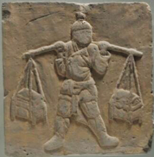 長30.5厘米,寬18.5厘米,厚5厘米,呈長方形。正面中間浮雕一挑擔男子,身穿右衽交領布衣、下著緊腿長褲,扁擔由后面搭在雙肩擔,被所挑重物壓彎,極富動感。