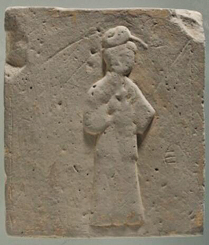 長30厘米,寬26.5厘米,厚4.5厘米,呈長方形。畫面中央刻有一位仕女形象。仕女儀態端莊,發髻高高盤起,衣著長裙,雙手抱著一個長柄執壺,輕移蓮步,徐徐向前,像是要給遠道而來的朋友斟上一杯家釀的美酒。