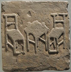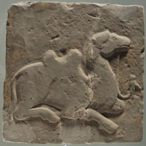 邊長20.5厘米,厚5厘米,呈正方形。駱駝構圖充滿整張畫面。雙峰駝呈臥姿,頭部昂起,似乎是在傾聽什么,韁繩拴在木樁上,像是在等待主人拿來美味的草料。駱駝造型比例恰到好處,生動傳神。