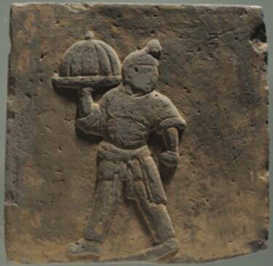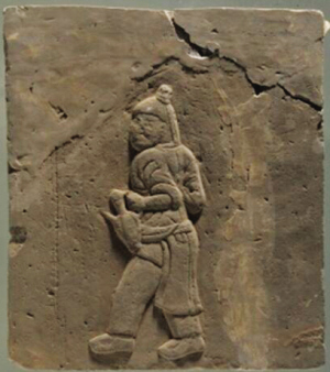 長30厘米,寬26.8厘米,厚5厘米。畫面中央為一男仆手持壺作行進狀。男仆頭戴幘巾,身著翻領長袍,雙袖卷起至肘部,前襟卷起掖于腰帶上,左手持有蓋長柄執壺,穿長褲,足穿靸鞋,上身前傾,似乎聽到主人的呼喚,正在匆忙前去斟酒服侍,整體畫面形象生動。