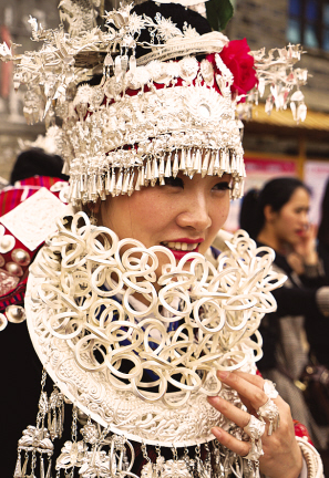 位于貴州省黔東南苗族侗族自治州臺江縣的施洞小鎮(zhèn),依仗著清水江流域便利的交通和發(fā)達(dá)的木材貿(mào)易,白銀作為貨幣在當(dāng)?shù)氐玫酱罅苛鬓D(zhuǎn)與積累。施洞地區(qū)的苗族,長期保持著以銀為飾的佩戴喜好和以“盛”為美的裝飾理念。施洞苗族銀飾也因其造型最為繁麗、銀質(zhì)最為優(yōu)良、工藝最為精細(xì),從黔東南諸多苗族支系中脫穎而出,成為苗族“盛飾”的典范。