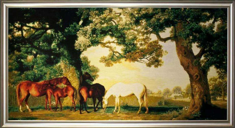 一般畫面較大,多數復制名畫、人物和風景照片。用線顏色往往達數百種,特別強調色階、色相的過渡,并注重人物神態的刻畫。作品常作為大型建筑的室內裝飾。