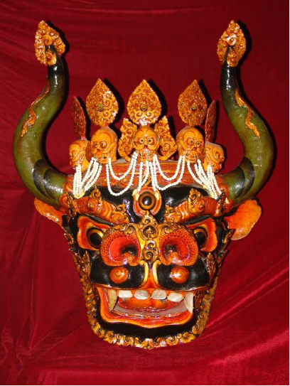 泥塑面具的制作也很有講究:“首先要將面具模型徹底風干,然后在表面敷上摻有液體樹膠和面粉熬制而成的糨糊,再用一小塊布將風干好的模子包好裹嚴,接著要敷一層柴薪混合物,同樣用另一塊布把泥模包實,反復四五次后,將模子放好讓它自然干透。這些步驟做完后,要用一根棍子敲打出包在里面的泥模,這樣就形成了布、樹、膠和面粉做成的一種面具。當然,做好后還要進行彩繪、涂清漆,這樣才能讓一個面具光彩奪目。”邊巴說道。
