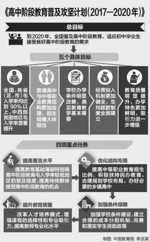 “高中教育是選擇性教育,僅僅提供學(xué)位,缺乏吸引力,學(xué)生不愿意上,普及目標(biāo)就難以實(shí)現(xiàn)?!苯逃肯嚓P(guān)負(fù)責(zé)人解釋說(shuō),在確保普及程度的基礎(chǔ)上,要體現(xiàn)全面科學(xué)的普及觀,防止簡(jiǎn)單追求數(shù)量和規(guī)模的增加。因此,除了2020年我國(guó)高中階段教育毛入學(xué)率將要達(dá)到90%這個(gè)總目標(biāo)外,《攻堅(jiān)計(jì)劃》還提出了5個(gè)具體目標(biāo):