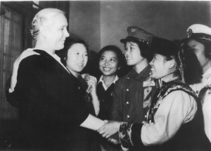 1955年9月蘇聯卓婭和舒拉的媽媽(左一)訪問中國時接見中國的“瓦爾瓦娜”(蘇聯電影《鄉村女教師》女主角)、全國青年社會主義建設積極分子阿角(右一),時有郝建秀(左三)、徐建春(左二)同志在場。 資料圖片