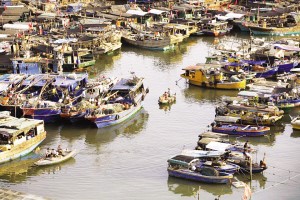 小快船靠上捕魚歸來的大漁船,收購、轉運海鮮漁獲(2014年攝)。