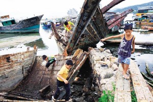 三亞漁港社區疍家人的孩子在沉船遺址玩耍(2007年攝)。