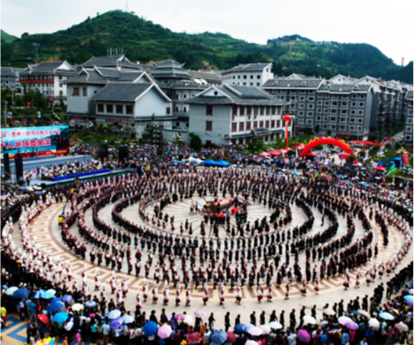 苗族的板凳舞主要流行于貴州革一、后哨、大塘、臺盤等地。是在走親訪友時,婦女們酒后隨興而起的一種舞蹈。舞蹈場地不限,或在某家里,或在寨壩上。這種舞蹈的伴奏樂器主要是板凳,因而得名板凳舞。舞蹈時有兩種跳法。一是由一名婦女敲擊板凳,其余婦女圍圈用雙手隨節拍拍手,雙腳輪換邊歌邊舞。歌詞內容結合活動內容隨興而編,但大多歌詞是圍繞攀親內容而唱。另一種板凳舞是參加舞蹈之人每人雙手各持一只凳子,集中在較寬的壩子上,一起圍著圈子轉跳,舞蹈動作是先走右腳用腳踉向外、前點兩點,與此同時雙手的板凳也擊兩下,之后收左腳向內、前點兩點,雙手板凳也即拍兩下。如此反復幾遍后,圓圈隊形又逐漸轉換為面對面并列兩隊形。舞蹈動作基本同前,舞時兩對面伸出右手持板凳相互擊一下,又換左手相互擊一下,二人在做這兩個動作時,各自的右、左腳跟也互換點地。之后,面對面各自轉身向外斜成“弓”字形擊了兩下,與此同時二人屁股相撞,百褶裙子飛揚。如此反復幾遍后,各人又邊擊板凳,雙腳同時起跳如蛤模跳躍狀,一邊手擊板凳,一邊與其他舞蹈婦女用臀部東擊西碰。如此反復狂舞,直到興盡方休。
