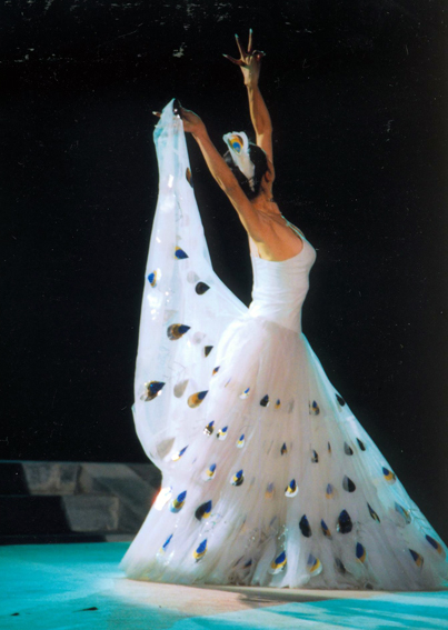傣族孔雀舞動作有著嚴格的程式和要求:孔雀舞一般由一、二人或三人表演,多為模仿孔雀飛出窩巢、靈敏視探 、安然漫步、尋水、飲水、戲水、洗澡、抖翅、曬翅、展翅與萬物比美、自由幸福。每個動作之前有起式,完了后有收式;有固定的步法、位置圖及固定的動作組合;每個動作組合又有固定的鼓點伴奏。架子孔雀舞的舞蹈語匯尤為豐富,有“飛跑下山”“林中窺看”“漫步森林”“抖翅”“點水”等惟妙惟肖模擬孔雀神態的動作(圖為傣族著名舞蹈家楊麗萍表演孔雀舞,劉軍供圖)。