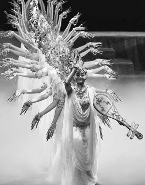 在敦煌舞的動作素材積累方面,無論是對敦煌壁畫舞姿的歸類、整理,對“敦煌舞特有的S型曲線運動規律”的發現,以及“運用中國古典舞蹈的節奏韻律,把靜止的姿態與其風格統一的動作過程結合起來,形成比較完整的舞蹈運動和造型體系”,還是在創作層面上《絲路花雨》對“反彈琵琶”典型壁畫舞姿的發展,《千手觀音》對“千手”舞姿造型的無限變化發展,以及《飛天》超越人體動作范圍極限對“三道彎”典型敦煌舞姿風格的強化等,都是敦煌舞在動作素材層面的積極建設和發展。
