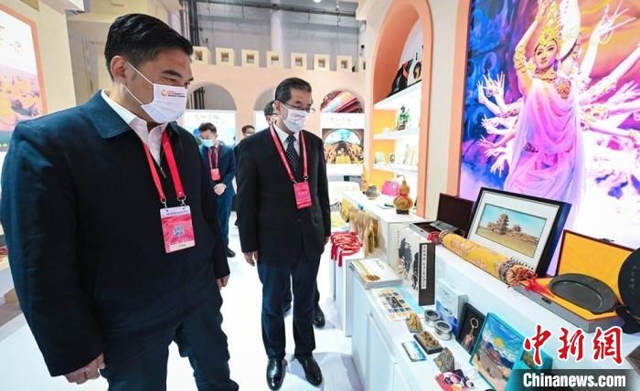 圖為甘肅省副省長孫雪濤(左)與甘肅省文化和旅游廳廳長陳衛中(右)一同參觀“甘肅館”。 甘肅省文化和旅游廳供圖