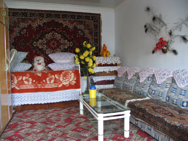 木刻楞房的室內結構一般有客廳、臥室、廚房和儲藏室四部分構成,房屋的整體結構呈四方形,建造有傾斜度較高的屋頂,利于雨雪不會覆蓋在屋頂,從而造成屋頂承重過高而發生坍塌。此外,俄羅斯族人一般都會選用紅色、藍色或者綠色的鐵皮將屋頂精心包裹一番。這不僅可以起到很好的防風御寒、防止雨雪滴漏進室內的效果,而且也使木刻楞房色彩十分和諧艷麗。房屋的正門之前一般會建造寬闊的門庭和圍廊,門內有過道,過道兩旁是臥室和客廳。室內的墻角有土坯壘砌的火墻。有的人家是大型壁爐,外包一層鐵皮,鐵皮上抹一層黑油,俗稱“毛爐”,是很好的取暖設備。室內陳設比較講究,臥室擺放著木床或鐵床,鐵床欄桿雕有花草圖像,給人以古雅之感。木刻楞房室內一般會在地面鋪上木地板,俄羅斯族人們也十分喜愛在家中鋪設飾有各類花紋圖案的地毯。