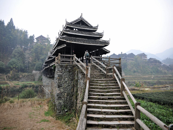 風雨橋以石拱木作,廊、屋、亭、閣為一體,造型別致、美不勝收。無論是遠眺還是進觀,都體現(xiàn)出獨特的審美意境。鏈接廊橋與屋亭的是長條青石,橋與村寨的連接則用花石鋪路,橋面主體是當?shù)厮寄静摹_@種自然生態(tài)環(huán)保的理念,更彰顯了瑤族人民獨特的審美境界。