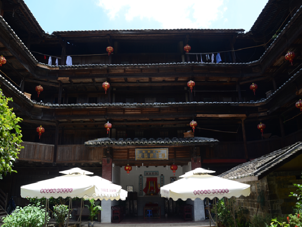 1995年它的建筑模型與北京天壇作為中國南北圓形建筑代表參加了美國落杉磯世界建筑展覽會,引起了轟動,被譽為“東方建筑明珠”。 客家土樓建筑閃耀著客家人的智慧,它具有防震、防火、防御多種功能,通風和采光良好,而且冬暖夏涼。它的結構還體現(xiàn)了客家人世代相傳的團結友愛傳統(tǒng)。試想幾百人住在同一幢大屋內朝夕相處,和睦共居當然是非常重要的,客家人淳樸敦厚的秉性于此也可見一斑。一進入土樓,你立即就能感覺到那種深沉的歷史感和溫和的氣氛。 全樓的設施布局既有蘇州園林的印跡,也有古希臘建筑的特點??胺Q中西合璧的建筑奇葩 。