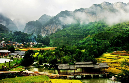昔日壩美村房屋以落地和半樓居兩種桿欄式風(fēng)格為主,主屋用木板架成,四周用樹枝圍攏,再敷上泥巴、牛糞攔合成的粘土,非常通風(fēng)、保暖,上蓋瓦頂、抱廂、前置涼吧或圍欄,樓上住人,樓下關(guān)牲畜、堆雜物、當(dāng)?shù)貕炎宸Q麻欄樓。《漢書·地理志》就有壯家“男耕女織”的記載:“男子耕農(nóng),種稻麻,女子蠶桑織績(jī)。”千百年來的刺繡技藝,之所以能夠代代相傳,延綿不絕,很大因素緣于它是不少壯族婦女賴以為生的基本技能。村民的食物、衣物、生產(chǎn)工具、生活用具基本上是自己生產(chǎn),寨子中隨處可見轉(zhuǎn)動(dòng)的水車、獨(dú)木舟、人工石磨、水磨、木碓、水紡織機(jī)、木榨油機(jī)、獨(dú)木風(fēng)箱、木梨粑、木背柴架、木梯、木菜板、木燈架、木三角獨(dú)輪推柴車、竹木水桶、葫蘆酒壺、木儲(chǔ)物器、石缸、石磙等生產(chǎn)生活工具。它們的古樸粗拙樣,凝固了歷史,傳遞著遠(yuǎn)古的文化信息。自2019年3月以來,壩美景區(qū)暫停對(duì)外開放進(jìn)行提質(zhì)升級(jí)改造。經(jīng)過一年多的建設(shè),一期工程已完成投資4億元,景區(qū)內(nèi)基礎(chǔ)設(shè)施及旅游產(chǎn)品業(yè)態(tài)都有了質(zhì)的提升。以世外桃源壩美景區(qū)為核心,以壯族文化為內(nèi)涵,以稻作田園景觀、普千村、冷熱泉等內(nèi)容為延伸,打造國內(nèi)首個(gè)集田園休閑度假、壯族文化體驗(yàn)、藝術(shù)創(chuàng)意創(chuàng)作、宗教朝圣等多重體驗(yàn)為一體的旅游度假區(qū),將通過改造民居、再造田園、以水為魂等方式打造現(xiàn)實(shí)版的“桃花源”。