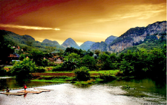 壩美,為壯語譯漢語為:壩—沖口,美—樹 ,因居住的沖口樹木多而得名。壩美村位于珠江流域西江水系馱娘江上游的阿科河畔。屬喀斯特地貌,區(qū)域內(nèi)山峰奇特,河谷幽美,阡陌縱橫,河流山泉蜿蜒奔流,溶洞層疊散布在山體峰內(nèi),冬無嚴(yán)寒,夏不酷暑,氣候宜人。因四面環(huán)山,不通公路,進(jìn)出寨子主要靠村前村后兩個(gè)天然的石灰溶巖水洞,村民們要摸著巖壁趟水、撐竹筏、劃獨(dú)木舟、坐小船,經(jīng)過950米長(zhǎng)的幽暗的“出水洞”和680米長(zhǎng)的“湯拿洞”才能進(jìn)出。由于地處偏僻,交通不便,基本不與外界交往,多年來壩美村長(zhǎng)時(shí)期與外世隔絕。壩美村水源豐富,氣候溫和,自然生態(tài)環(huán)境未被污染,負(fù)氧離子質(zhì)數(shù)高出城市數(shù)倍,游人在此休憩,心曠神怡,是一個(gè)溫濕潤(rùn),四季宜人的旅游勝地。就生態(tài)環(huán)境和歷史淵源來說,《桃花源記》問世1500多年,只聞其名,不見其實(shí)。相傳除唐代確認(rèn)湖南省桃源縣的桃源洞為其原型外,目前全國就有冠名“世外桃源”的地名16個(gè)之多。而今天的壩美,不僅十分相似,而且還神似東晉文學(xué)家陶淵明筆下所描寫的“林盡水源,便得一山。山有小口,仿佛若有光;便舍船從口入……土地平曠,屋舍儼然,有良田美池桑竹之屬;阡陌交通,雞犬相聞……”的世外桃源。而且在當(dāng)?shù)卮迕裰杏性S多歷史傳說:北宋皇祐四年(公元1052年),壯族起義領(lǐng)袖儂智高在邕州(南寧)昆侖關(guān)被狄青打敗后,退入以其繼父儂夏卿為首領(lǐng)的特磨道(廣南)后,至和二年(1055年),宋朝廷又派楊文廣領(lǐng)兵進(jìn)剿,儂智高在突出重圍轉(zhuǎn)至阿科(今廣南縣壩美鎮(zhèn)治所)與宋軍周旋,終因寡不敵眾而離開阿科轉(zhuǎn)戰(zhàn)于丘北、開遠(yuǎn)、蒙自、元江等地,后到大理不知所終。