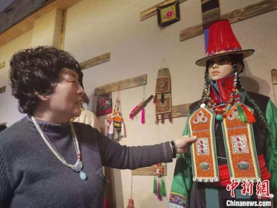 圖為柯璀玲介紹收藏的裕固族服飾。 史靜靜 攝