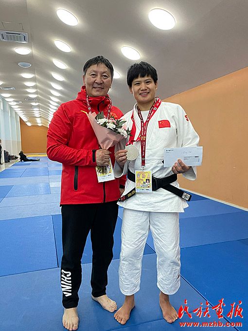 烏日根桑格(左)隨國家柔道隊(duì)參加 2021年世界柔道大滿貫比賽。圖為與國際級運(yùn)動健將、國家柔道隊(duì)隊(duì)員楊俊霞合影留念。
