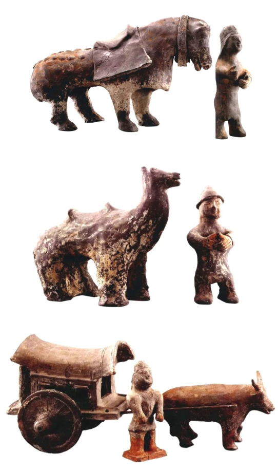 墓葬形制方面,大學路北魏墓弧方形墓室結構,是在中原漢晉方形墓葬形制基礎上,融入了游牧民族圓形穹廬造型因素形成的新結構,并對其后的隋唐墓葬也產生了一定影響。隨葬陶器中,根據陶俑的衣著及相貌,可分辨出既有漢人、鮮卑人形象,可能還有西域胡人形象,體現出當時各族人群共同生活的場景;家禽及牲畜等動物形象中,中原定居民族喜見豢養的雞、犬、豬等禽畜類與游牧民族賴以生存的羊、馬、牛及駱駝等牲畜類動物共處的現象,體現了農耕和游牧凝于一體的生產生活方式。雖然這座墓葬的墓主族屬身份已無法考辨,但墓葬所體現的民族融合、文化融匯的氣息十分強烈。