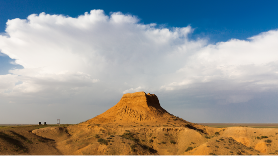 (東紅烽火臺,位于海南區巴音陶亥鎮東紅村,整體為紅黏土夯筑而成,現高9.3米)