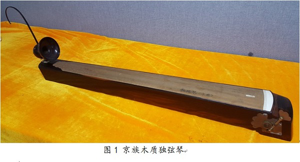 京族獨弦琴的制作工藝傳統,其材質有竹、木質兩種。竹制獨弦琴的琴體通常取大斑竹為原料,制作時選粗細勻稱、質地密實的一段竹子,截長為120厘米左右長度,再劈成1/3和2/3兩部分,取2/3部分的竹筒進行打磨、打孔,再安裝竹制搖桿、麻繩或竹篾削制的琴弦,竹質獨弦琴即制成;木質獨弦琴的琴體多選生長于當地的桐木為原材料,取長約100-120厘米的木料,切割成數塊木板,打磨后將木板拼成長方形木匣為琴身,一端插上一根與琴身呈直角的、用牛角制成的弧形柱子,圓柱上安裝一瓢型(葫蘆形)共鳴器,再將一根金屬絲從瓢中心引向琴的另一端,固定在的弦鈕上,木質獨弦琴即制成。