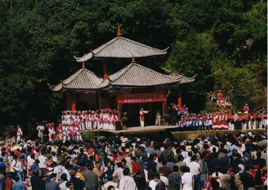 石寶山歌會是滇西北地區以白族為主的各少數民族青年男女,用歌聲來表達愛情和尋找愛情的盛大聚會,也稱“朝山歌會”,在每年碩果累累、稻谷飄香的農歷七月二十七日至八月初一暨時在石寶山上舉行。歌會期間來自劍川、洱源、鶴慶、蘭坪、云龍、大理、麗江等三州八縣的各族群眾身著盛裝,身掛龍頭三弦,紛至沓來。方圓20多平方公里的石寶山山間小道上,人流如潮,宛如一條條五彩斑斕的長龍。參加歌會的不僅有青年男女,也有中年婦女、壯年男子,還有老翁、老嫗,但以青年居多。有的是去年歌會相識,今年來相會;有的相知相愛,但未結成良緣的,借歌會互相訴說相思之情;而更多的青年男女則是用歌聲來尋找愛情。