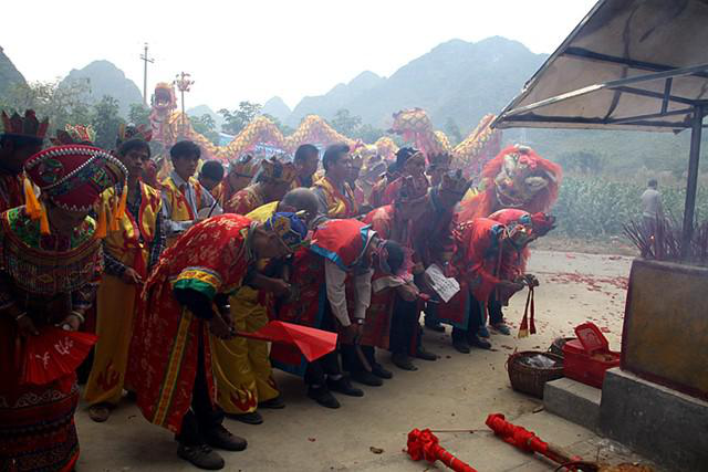 壯族霜降節頭降的早晨,先要在戲臺舉行隆重的酬謝活動。人們進行祭拜,從請神、求神到送神,將壯族美好和諧的祈愿寄托在美好的自然事物身上,以表達對自然之神的崇敬之情,表達祈盼五谷豐登的良好愿望。近年還增加了祈福長壽的內容。