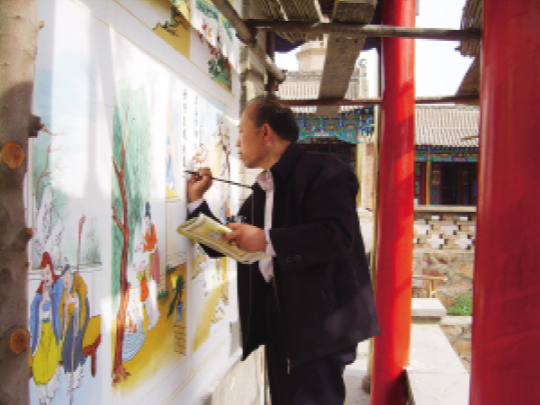 在以后的古建彩繪修繕中,陳進(jìn)德不斷深入磨煉技術(shù)。在彩繪技藝上,他按照建筑群體的不同結(jié)構(gòu),結(jié)合當(dāng)?shù)貍鹘y(tǒng)習(xí)俗,一般建筑外觀以旋子如意彩畫形式配彩,走廊采用蘇氏混彩的藝術(shù)布局,突出藝術(shù)畫廊的彩畫特色,門扇格子以五彩形式瀝粉配有畫面,突出人物清高、山水大雅、花鳥活潑、博古清香、書法淋漓,既吐納了當(dāng)?shù)氐墓沤L(fēng)格,又彰顯了民族文化的積淀。除了注重彩畫技藝,陳進(jìn)德在顏色工料上也比較講究。