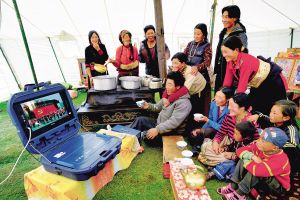 四川省甘孜州甘孜縣卡龍鄉卡龍村的牧民們高興地在新型帳篷中通過移動電視收看節目。尹鋼攝