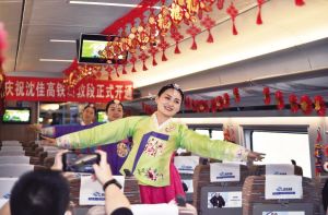 沈佳高鐵長白山至敦化段開通運營,將促進沿線旅游業和冰雪經濟快速發展,進一步加強民族團結,助力長吉圖開發開放、深度融入 “一帶一路”。圖為列車工作人員在車內表演朝鮮族歌舞。 新華社發