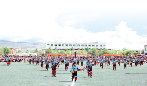 走進(jìn)拉孜鎮(zhèn)中心小學(xué),伴隨著課間操音樂(lè),孩子們或旋轉(zhuǎn)或跳躍,朝氣蓬勃。作為西藏自治區(qū)首批“非遺特色縣”,拉孜縣將非物質(zhì)文化遺產(chǎn)拉孜堆諧改編成堆諧操,并在校園推廣。