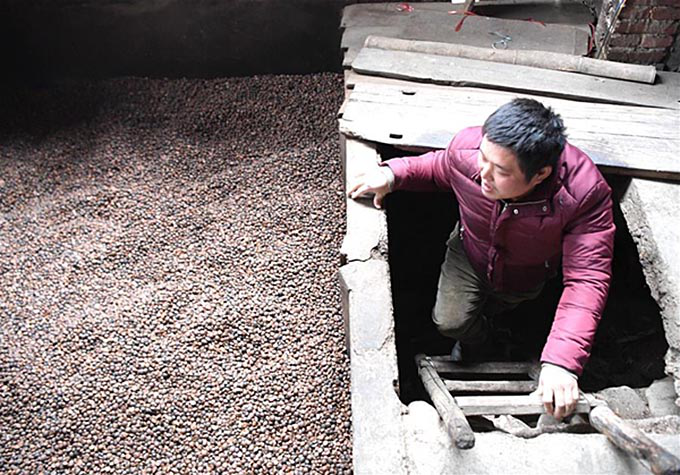 在廣西桂林市龍勝各族自治縣泗水鄉龍甸村里排壯寨,侯光祖幫爺爺侯正榮查看茶籽烘烤情況(新華社記者周華 攝影)