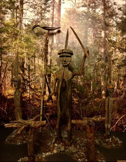 展區內還放置著一組木質神偶,這些神偶來自赫哲族部落。佇立在最中間的神偶起著山神的作用,面目清晰與人等高,手中舉著木劍,挖空的腹部能吞掉妖魔鬼怪,一顆碩大的心臟代表強悍的法力,靠墻斜放著一根高高的木桿,頂端棲息著一只鳥(喬卡鳥)。