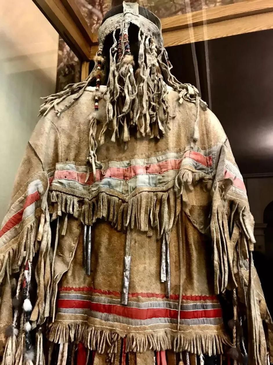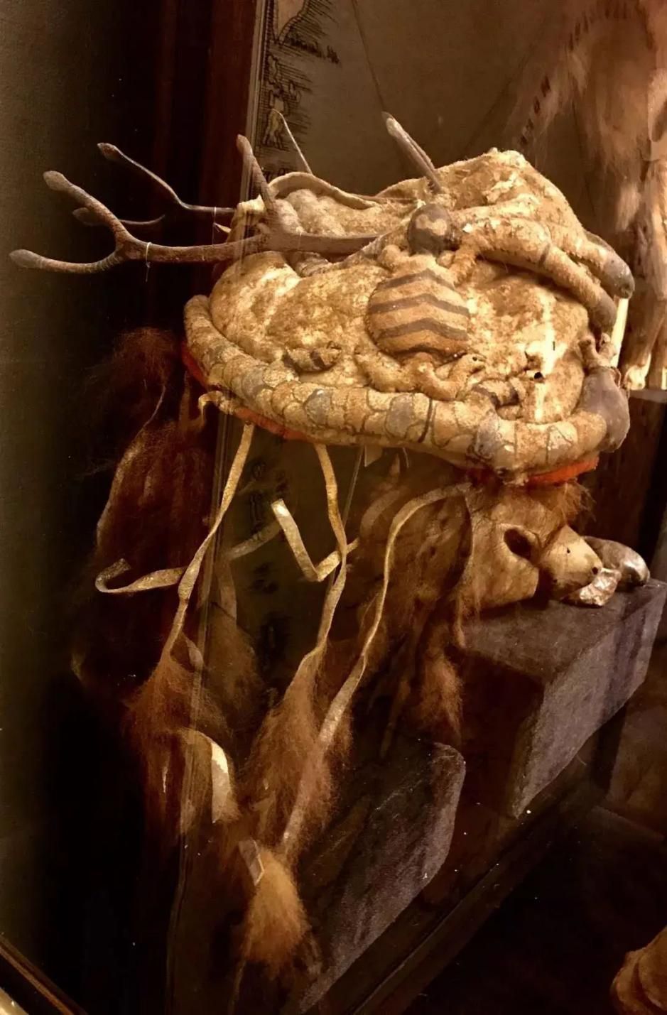 展區內還陳列著幾套保存完整的薩滿服飾,有鹿皮、獸皮、魚皮和纖維等多種材料。與國內留存的薩滿服飾不同的是其鹿角帽的制作,鹿角帽上裝飾著龜、蛇和神偶形象,頂端八岔鹿角的材料是金屬。