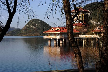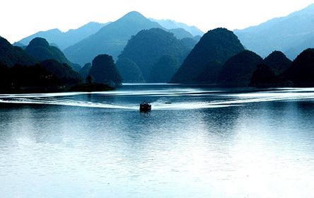 百花湖在朱昌鎮旁,湖中有100多個小島,以湖汊多、島嶼多見勝,遠眺之下,很有幾分江南水鄉的韻味。游覽百花湖的最佳時間是春天,那時百花湖上就會百花盛開,姹紫嫣紅,百花湖也是因此而得名的。景區以湖光山色和巖溶地貌的自然景觀為主體,兼具秀、幽、奇、巧的特色。
