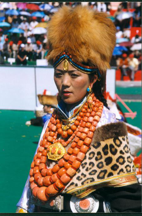 藏族婦女發飾因地域之別而顯得豐富多彩。西藏部分地方的婦女喜戴巴珠,拉薩附近的婦女所戴三角形巴珠,平系與頭頂,兩枝向前,將分梳的兩條發辮分別盤在兩枝上。日喀則、江孜一帶的婦女戴弓形巴珠,弓背向上,梳成多條的發辮分別掛在弓的兩端。貴重的巴珠上面鑲有珊瑚、瑪瑙等,顯得富麗堂皇。姑娘一戴巴珠,就意為著長大成人,因此,第一次戴巴珠時,家中要為姑娘舉行傳統的成人儀式。