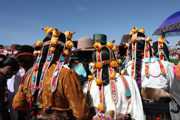 藏族婦女發飾因地域之別而顯得豐富多彩。西藏部分地方的婦女喜戴巴珠,拉薩附近的婦女所戴三角形巴珠,平系與頭頂,兩枝向前,將分梳的兩條發辮分別盤在兩枝上。日喀則、江孜一帶的婦女戴弓形巴珠,弓背向上,梳成多條的發辮分別掛在弓的兩端。貴重的巴珠上面鑲有珊瑚、瑪瑙等,顯得富麗堂皇。姑娘一戴巴珠,就意為著長大成人,因此,第一次戴巴珠時,家中要為姑娘舉行傳統的成人儀式。
