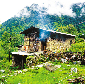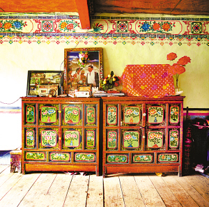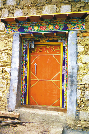 房屋大都是3層,上層存放干草和秸桿,下層關養(yǎng)牲畜,中間一層是居室。居室用木板隔間,里間較小是已婚子女住的,外間寬敞,是多功能堂屋。臨窗處設火塘,以利排煙,是家庭生活中心和待客之處。火塘上架著碩大的鐵三角架,上面是六七厘米寬的鐵板圈,擦得錚亮,能烤制食物。墻角處供奉佛像,擺放領袖像。房門安設木鎖,用十幾厘米的木鑰匙開啟,都是由硬木刻制,光滑耐用。