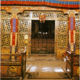 大門由于它的位置所在不應該列入室內裝飾,但它與室內裝飾息息相關,連成一體,故我們把它當作室內裝飾在這兒加以介紹。門框裝飾包含門框本身、門楣、門楣上的屋檐、門板等。藏族建筑大門裝飾十分講究,從屋檐到門坎都用雕、繪的手段充分加以裝飾。屋檐用兩道方本間隔排列,上蓋青石片和黃土筑成底小頭大的形狀,它不僅有美觀的裝飾效果,而且起到防水作用。屋檐下是門楣,門楣上彩繪各種圖案,門框的木構件上雕刻蓮花花瓣和累卷疊函凹凸方格圖案,這種圖案處理形式大部分民居大門大同小異。門板為單開式,板門為了加固起見上、下分層釘鐵條。門板一般涂單一色,不作繪畫處理。除了這些裝飾以外,門相上掛短縐簾,門框左右邊緣墻上涂兩道黑色豎條,每年過年前短縐簾要棄舊換新,黑色豎條與粉刷外墻一道重新涂漆,這是一般民居門框裝飾。寺廟門框裝飾較為復雜,門楣的間隔方木上加一層雕刻動物頭像的木雕作品排成一行,裝飾門楣這一板塊,門框木構件多則六、七層,層層雕刻各種圖案,可見其講究程度。寺廟門板大多是對開式,用鐵條包裝門邊緣,中間分層釘鐵條,涂一層單一的顏色,特殊殿堂如擴法神殿大門門板上要進行繪畫處理,寺廟大門講究厚重、莊嚴。無論是民居大門還是寺廟大門,其裝飾要求與室內梁柱裝飾相協調,從顏色的運用到雕刻內容都要做到這一點,保持內外裝飾效果統一。