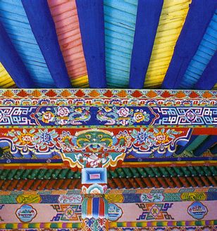 柱頭裝飾包括柱頭、斗拱、大梁等部位的雕刻、彩繪。在藏族居室中柱子、橫梁位置顯要,因此對這部分的裝飾在整個室內裝飾中至關重要。無論高雅精致的殿堂還是普通百姓的民居都充分認識到這一點,進行合理裝點以求莊嚴、堂皇、舒適的效果。就拿寺廟集會大堂的柱頭、橫梁來講,裝飾十分考究。天花板下的椽子木頂端整整齊齊地、略有間隔地排列在大梁上方,用彩繪的辦法進行裝點。椽子至大梁之間夾著兩道橫杠,其上道用累卷疊函凹凸方格木雕處理,下道橫杠用蓮花瓣依次排列的雕刻或彩繪完成,這種裝飾是約定俗成的,上下圖案不能隨意調換。橫梁上的裝飾大多采用填充連接長方格來進行。橫梁表面劃分大小等同的長方格,這些連接的長方格內或填寫梵文經文,或繪各種花卉,用這樣的手段裝飾大梁。柱頭與橫梁之間是斗拱,藏族建筑對斗拱的裝飾非常講究。斗拱分兩層,上為長弓,下為短弓。斗拱長短兩弓本身形狀要精心雕摟,其表面也用雕刻著色的辦法加以渲染,以求良好的裝飾效果。斗拱裝飾有簡有繁,最簡單的斗拱形狀為梯形,這種不加任何雕飾的斗拱多見于底層的儲存室內。而寺廟建筑大堂、佛堂之類重要殿堂內的斗拱是經過精心雕鏤的藝術品,尤其是斗拱長弓形狀千姿百態,通常見得較多的有祥云狀,此外還有各種花瓣狀,其裝飾效果相當強。除了斗拱形狀的雕刻外,表面上雕刻各種圖案獲得錦上添花的效果。長弓中心雕刻佛像,兩邊及邊緣雕刻祥云、花卉、整個斗拱表面顯得飽滿、大方。柱子、柱頭也是裝點的一個良好的空間,柱子形狀有圓有方,也有部分多角柱。柱子最上面的部位或雕或繪花瓣,在下是長城箭垛式圖案,這兩樣圖案的下面是短簾垂鈴式圖案,所有柱頭裝飾圖案基本上按此模式制作。除了雕鏤精細的寺廟大殿柱頭大梁裝飾以外,大量的柱頭裝飾見于藏族民居室內。民居室內柱頭大梁裝飾的基本走向、風格與寺廟裝飾設有大的區別,彩繪圖案、顏色運用、布局結構除了個別外,與寺廟裝飾相同,只是民居室內柱頭大梁裝飾多半是彩繪,幾乎見不到雕刻,這是經濟條件所限呢還是等級待遇不同不得而知。兩者除了裝飾上的簡繁區分之外其余部分很好地保持了藏民族建筑風格的一同性。