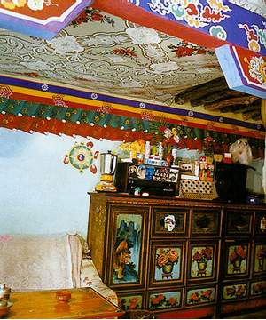 藏族民居室內裝飾講究工整、華麗、亮堂,上至天花板下至與地板相接的墻角都采用雕刻、彩繪等藝術手段加以裝點,尤其是橫梁、柱頭和大門等木結構空間是充分展示裝飾才能的地方,在這里裝飾效果盡其所能。此外寺廟重點佛堂,回廊墻壁上繪制彩畫,這也是一種重要的裝飾手段,而百姓居室內的墻壁上用繪制花卉、彩條來取得裝飾效果。